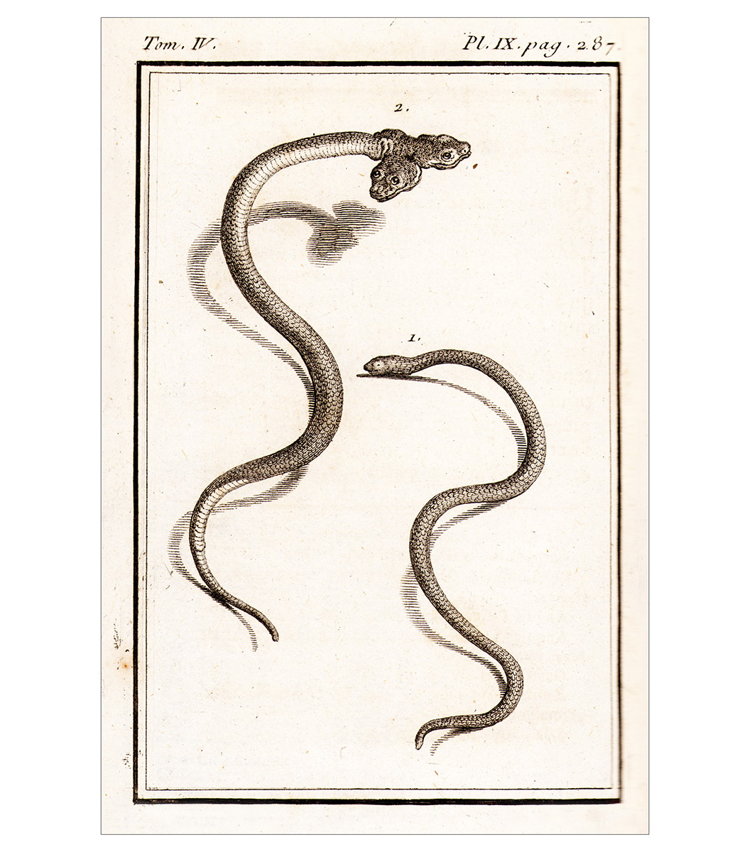 Ilustración de la «serpiente monstruosa de dos cabezas» y la lombriz. Grabado de Marie-Anne Rousselet, la «Viuda Tardieu» (1732-1826) sobre un dibujo de Jacques de Sève (act. 1742-1788) que representa una serpiente bicéfala y una lombriz. La policefalia entre las serpientes es extraordinaria. Por lo general, no viven mucho, aunque en cautividad pueden alcanzar más de diez años de edad. La mitología recoge estos especímenes con diferentes apelativos: Hidra, hija de Tifón y Equidna entre los griegos; anfisbena o serpiente con una cabeza en cada extremo de su cuerpo, como describen los aztecas.