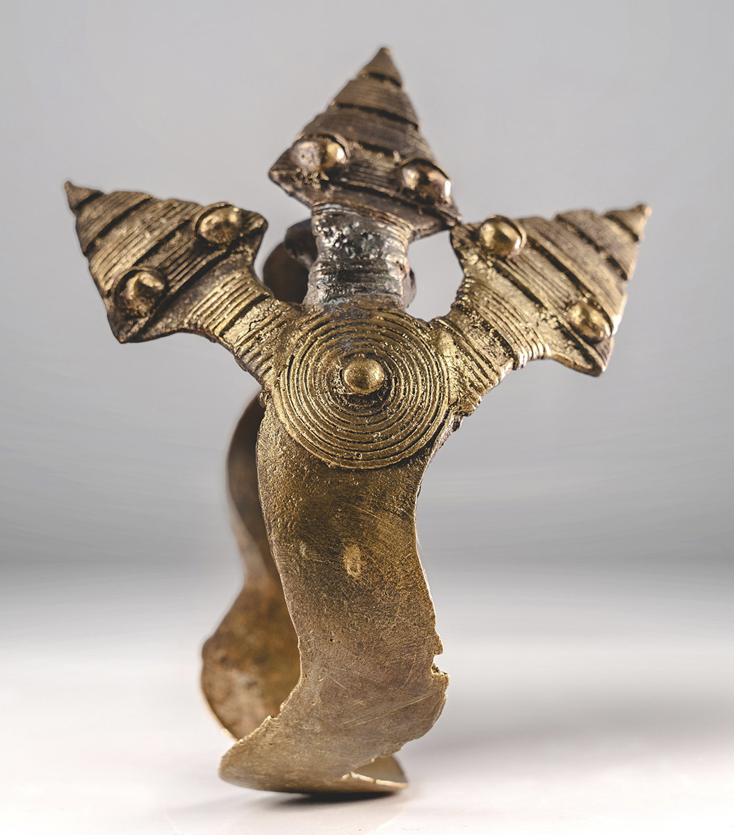 La pulsera tricéfala del pueblo lobi en bronce es un artefacto tradicional, usado como joyería ritual o de combate, se caracteriza por su diseño. En este caso, con tres cabezas de serpiente que simbolizan protección espiritual o poder ancestral. Este tipo de brazalete, elaborado mediante la técnica de fundición a la cera perdida, presenta decoraciones exteriores como resaltos o cordones rematados en casquetes esféricos.