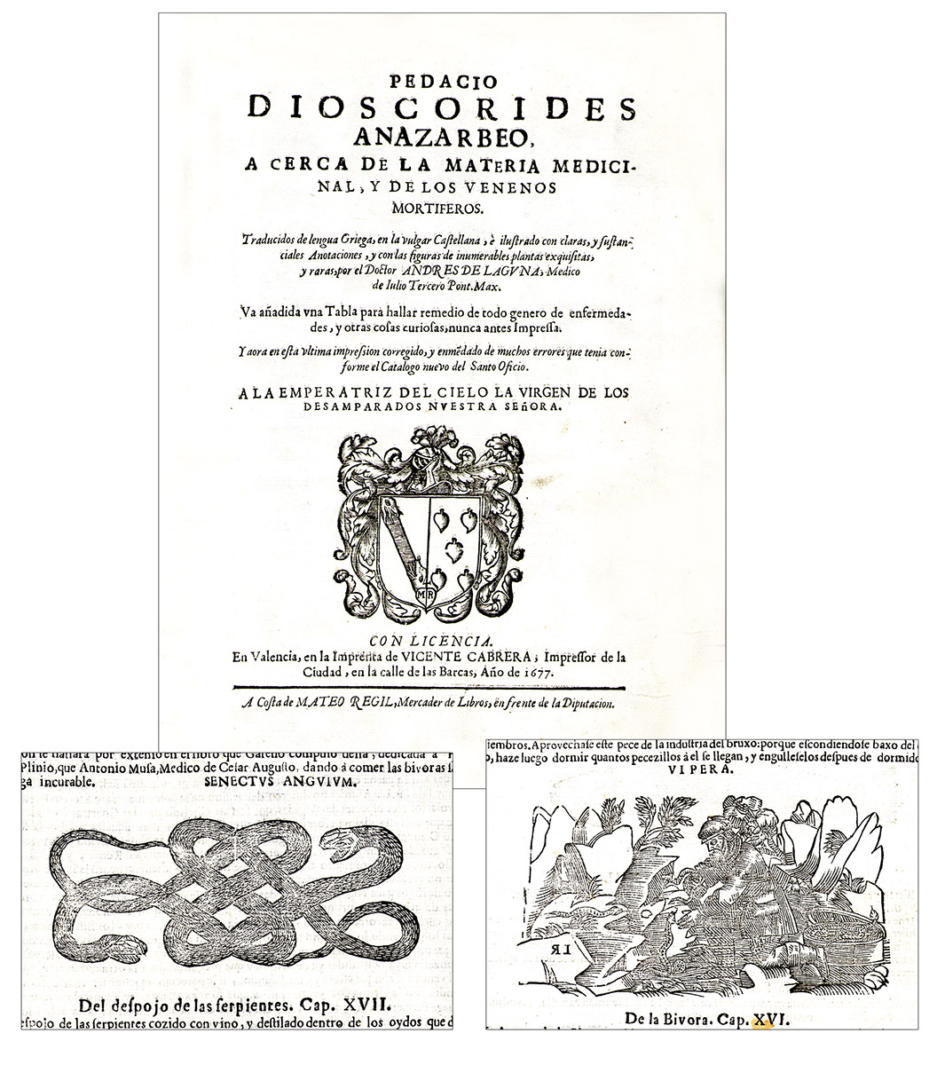 Acerca de la materia medicinal y los venenos mortíferos / traducidos de lengua griega, en la vulgar castellana, e ilustrado con claras, y sustanciales anotaciones y con las figuras de inumerables plantas exquisitas, y raras, por el doctor Andrés de Laguna (1499-1559). En Valencia: en la imprenta de Vicente Cabrera, 1677.