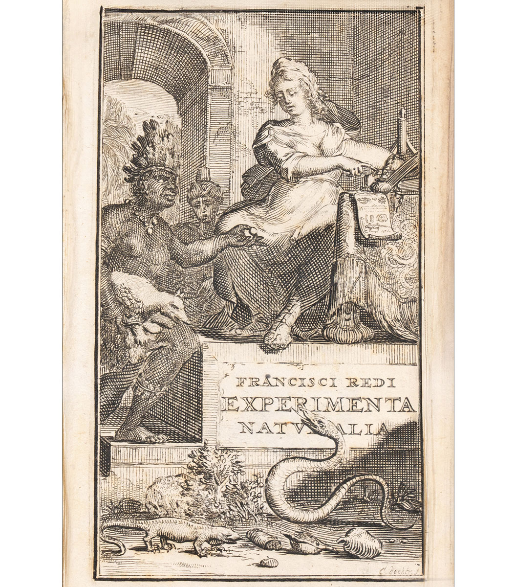 En el frontispicio de esta obra, firmado por Cornelis Decker, se representa la alegoría del enfrentamiento de Redi con sus oponentes: Minerva sentada ante una mesa con instrumentos de investigación (microscopio) está rechazando la oferta de la riqueza de las Indias, un armadillo y una piel de serpiente por no poder comprobar su efectividad médica.