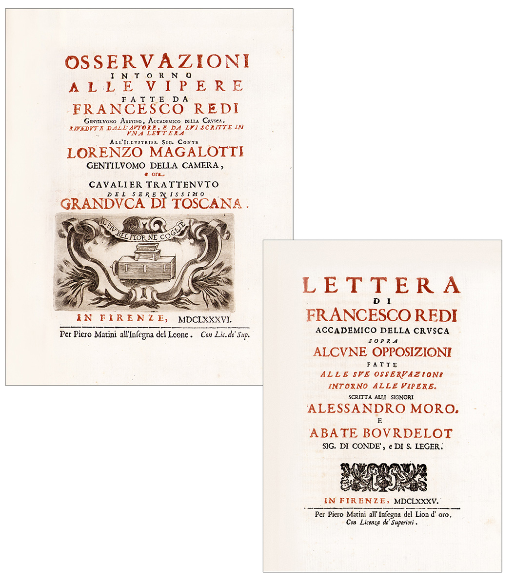 En la misma encuadernación: Lettera di Francesco Redi accademico della Crusca sopra alcune opposizioni fatte alle sue osservazioni intorno alle vipere. In Firenze, per Piero Matini, 1685.