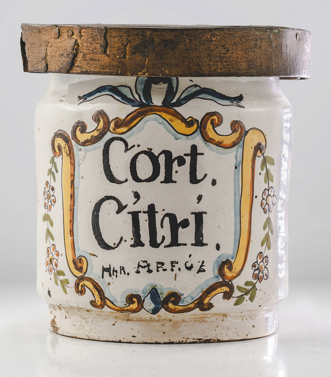 Bote para contener corteza de cítricos. Inscripción: «Cort. Citri.» (Corteza de cítricos). Cerámica de Bañolas. Siglo XVIII.