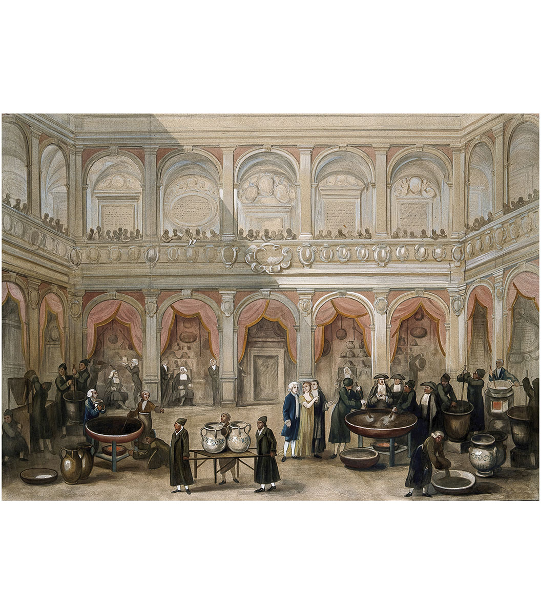 «Boticarios e inspectores examinan el proceso de preparación de la triaca en Bolonia», Aleardo Terzi (ci. 1904) a partir de una obra de Domenico Ramponi (1818). Biblioteca dell’Archiginnasio, Bolonia.