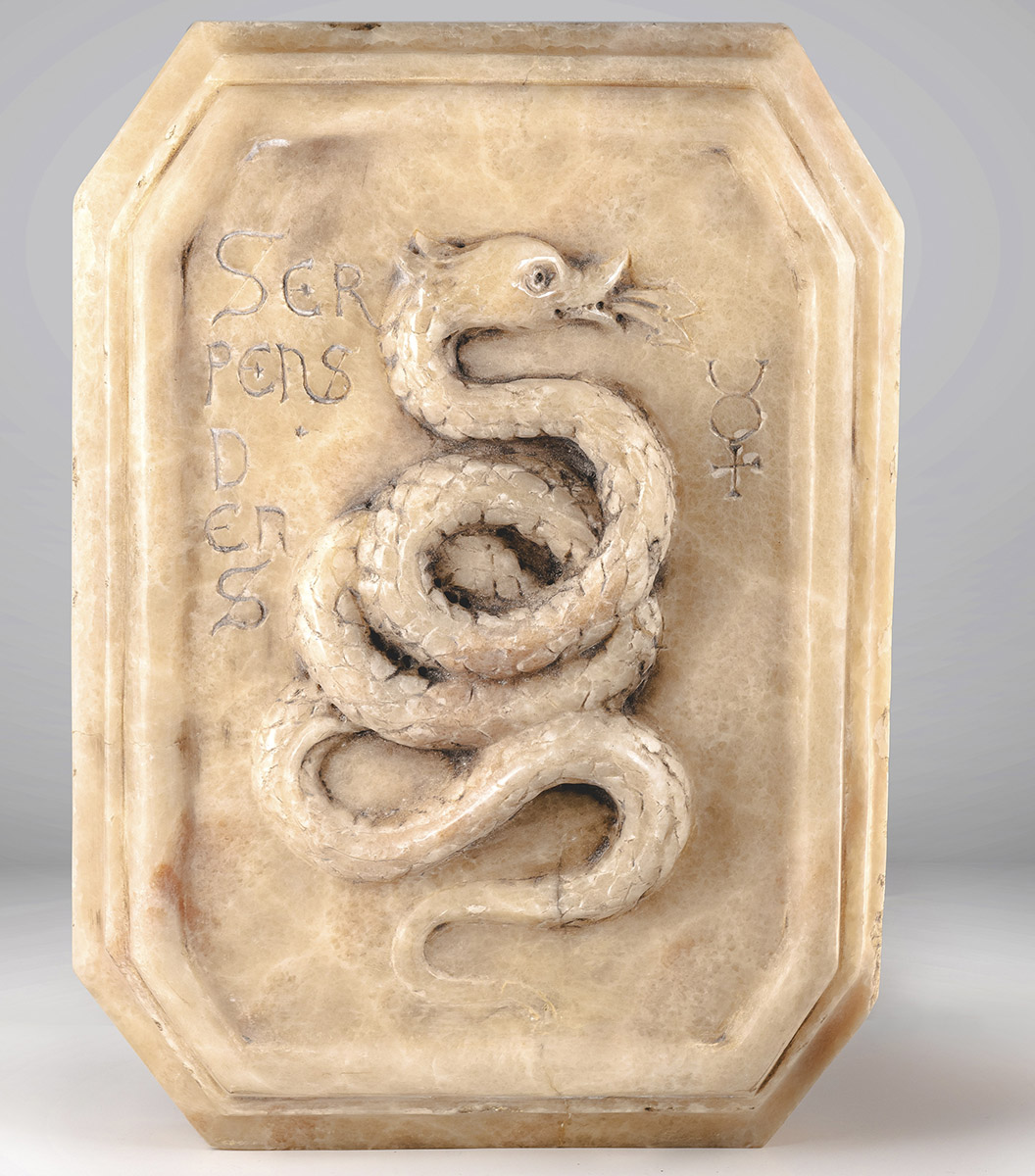 Placa de mármol con la representación en relieve de una serpiente enroscada que podría ser el Biscione, símbolo de Milán; además aparece el símbolo del mercurio y la palabra serpens, simbolizando ambos la medicina y el medicamento.