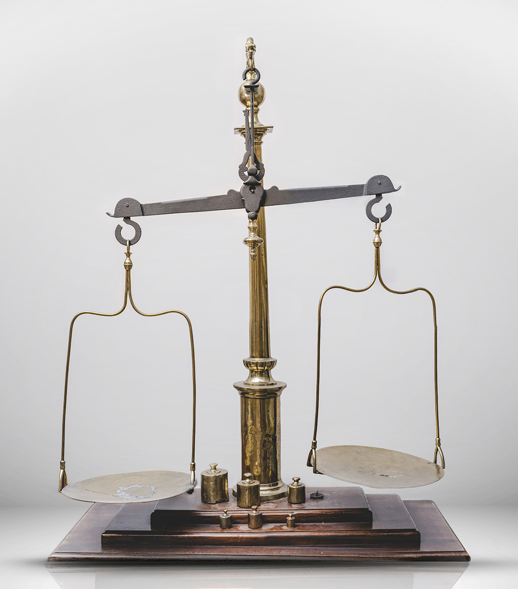Las balanzas de metal y madera, con dos platillos que cuelgan de una varilla de apoyo horizontal, la cual descansa en su centro en un punto de apoyo, fue un instrumento habitual para comparar pesos; de ahí su presencia en la totalidad de las boticas ilustradas y decimonónicas.