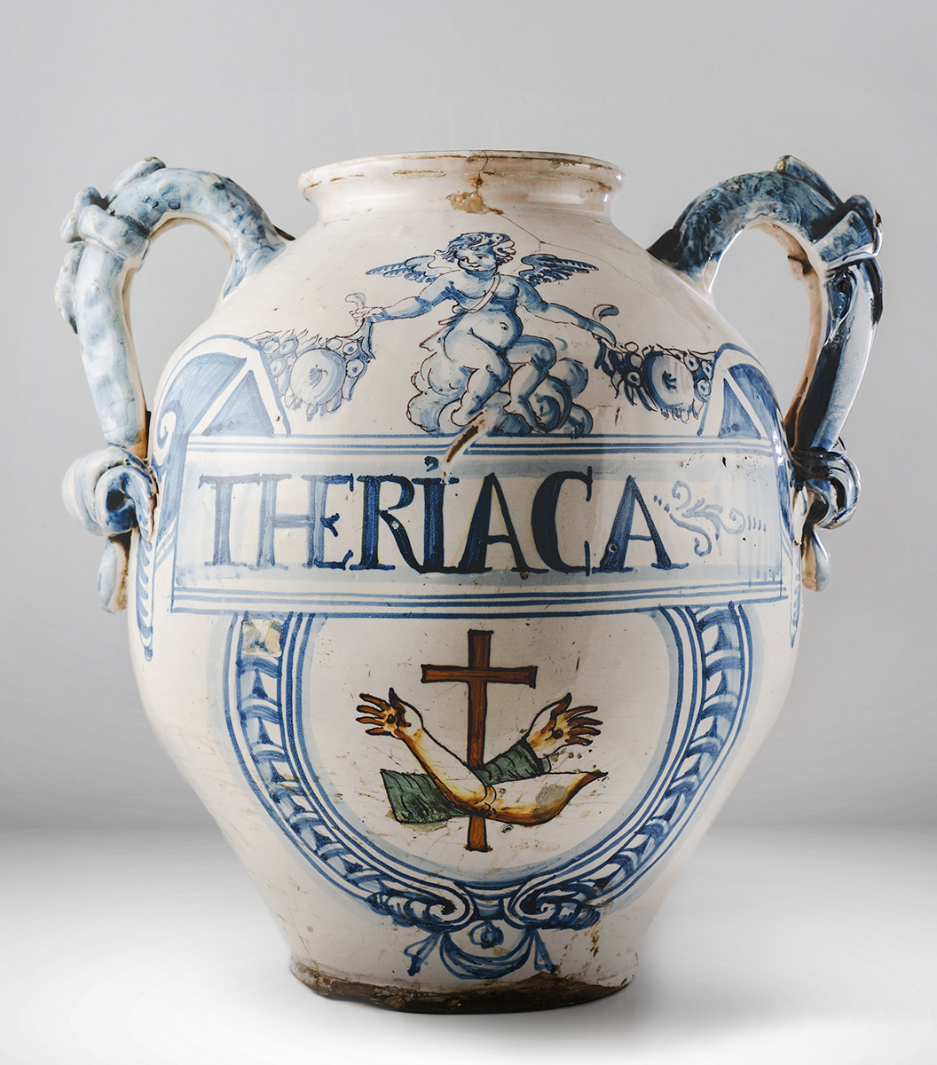 El original de este bello envase para el macerado de la triaca se encuentra en la antigua botica del Museo Paul-Dupuy, el museo de artes decorativas e historia de Toulouse.