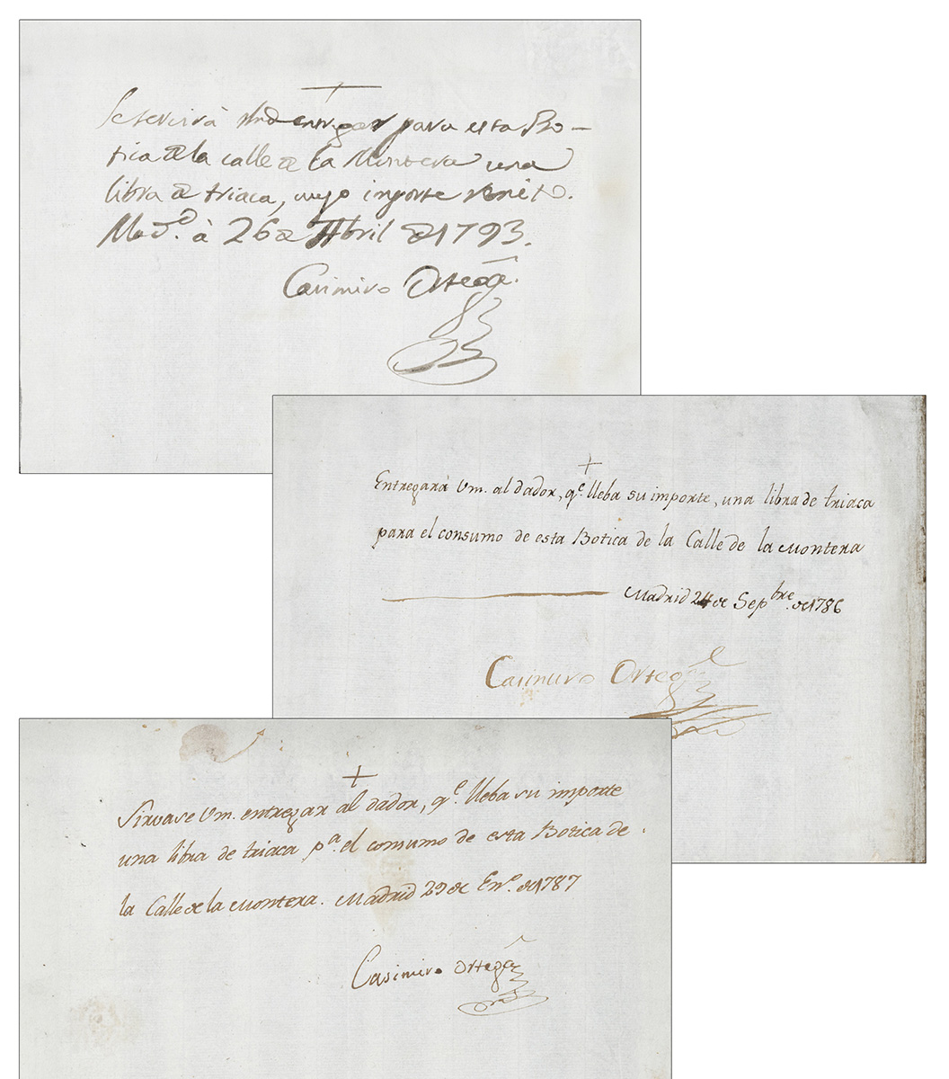 Tres recibos, con la firma de Casimiro [Gómez] Ortega, relativos a la adquisición de triaca magna para la botica de la calle Montera. Madrid, 24/09/1786; 29/01/1787; 26/04/1793.