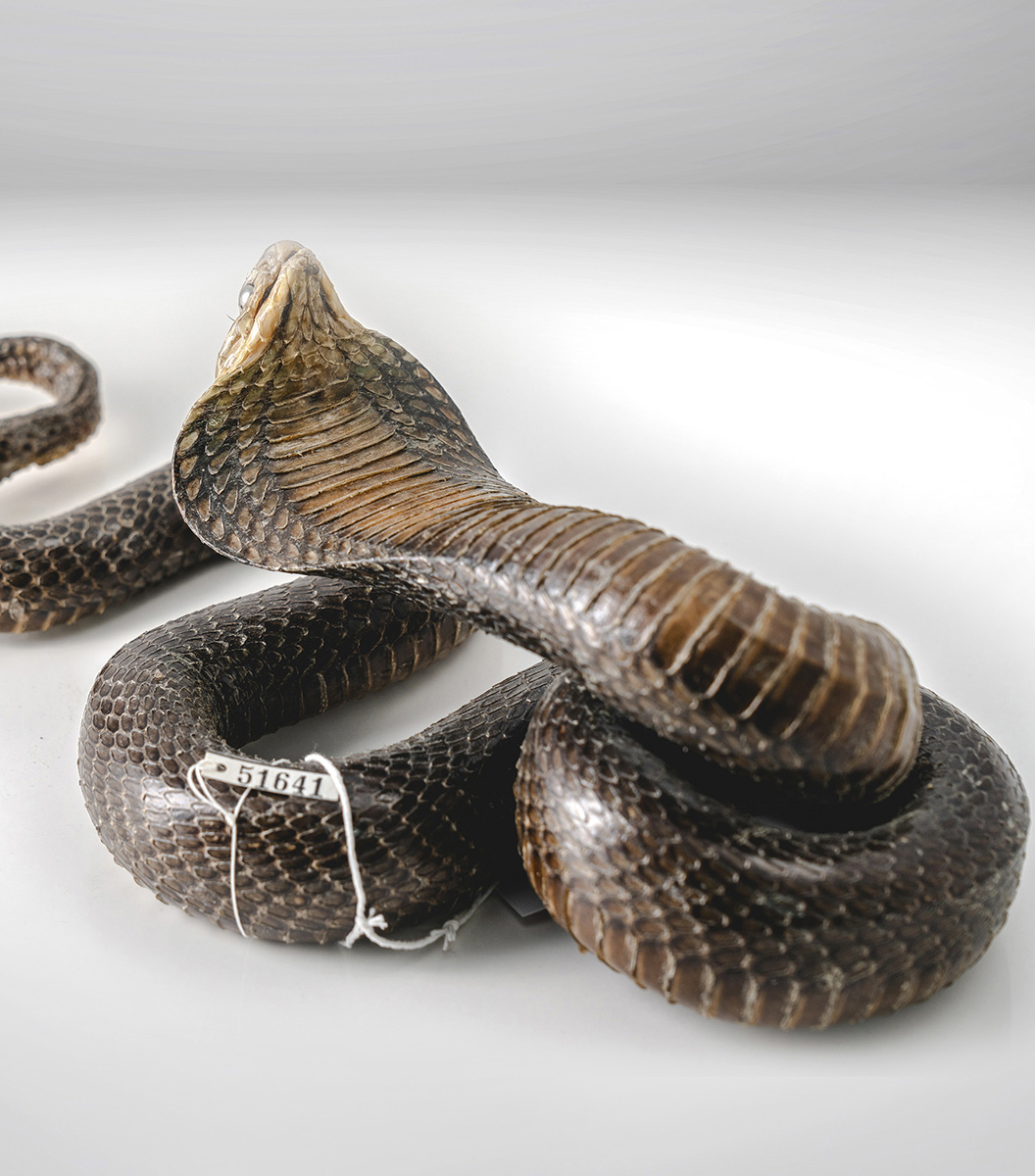 Naja haje, conocida como cobra egipcia, es una serpiente venenosa distribuida principalmente por el norte de África, desde el Mediterráneo hasta regiones del África oriental y nororiental, y en áreas de Oriente Próximo. Habita ambientes áridos, sabanas, zonas agrícolas y entornos humanizados, mostrando una notable capacidad de adaptación. Es una especie de fenotipo variable, con una amplia gama de coloraciones; en el noroeste de África, sobre todo en Marruecos, los adultos presentan con frecuencia una coloración uniformemente oscura o negra. Como otras cobras, posee dentición proteroglifa y un veneno neurotóxico. Su característico despliegue defensivo de la cofia, resultado de la expansión de las vértebras cervicales y las costillas asociadas, actúa como una eficaz señal visual de advertencia. Históricamente, esta especie ha sido asociada a la muerte de Cleopatra, ya que la tradición identifica a la cobra egipcia como el animal utilizado en su suicidio. En Marruecos, además, ha estado vinculada durante siglos a los espectáculos de encantadores de serpientes.
