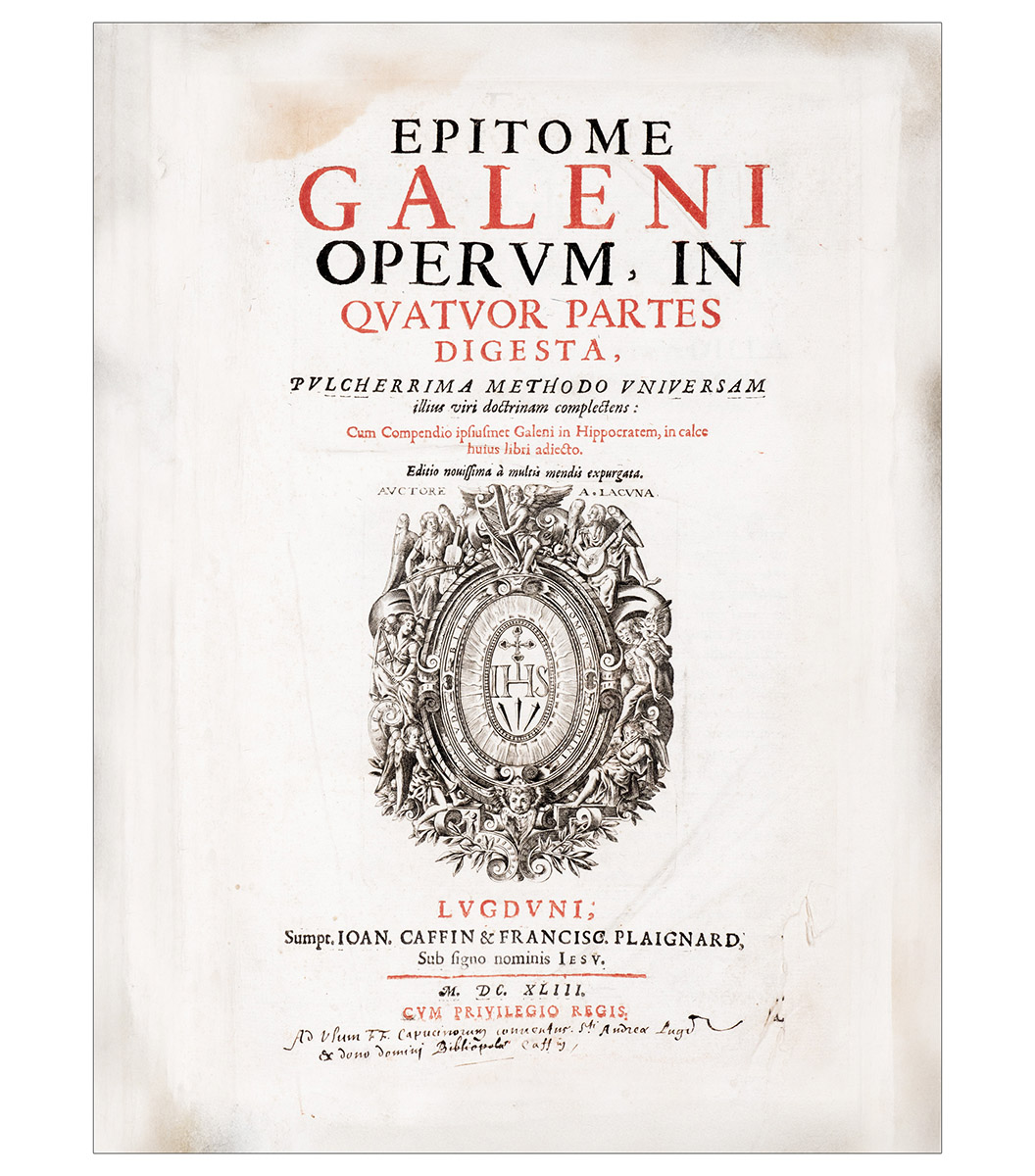Epitome Galeni operum, in quatuor partes digesta… cum Compendio ipsiusmet Galeni in Hippocratem… Sumpt. Ioan. Caffin & Francisc. Plaignard, sub signo nominis Iesu, 1643. Colección particular prof. Jorge Alvar Ezquerra.