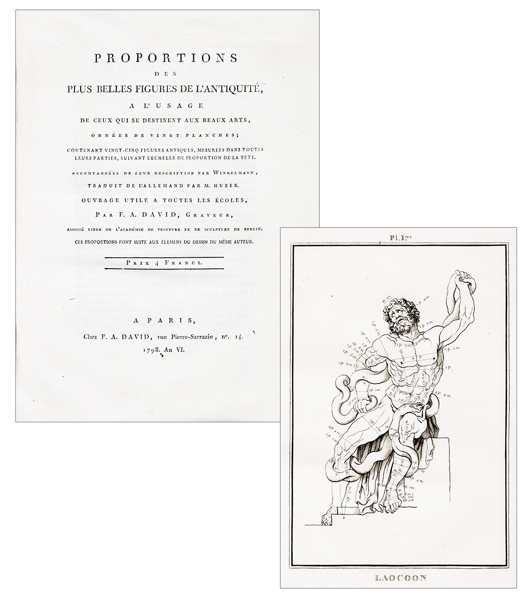 François‑Anne David (1741-1824), no confundir con Jacques‑Louis David (1748–1825), pintor neoclásico de «La muerte de Marat», fue uno de los ilustradores más elegantes de su tiempo. Destacó en la realización de retratos y la reproducción de obras maestras de la Antigüedad. Esta obra, editada por el propio F. A. David e impresa en el taller de Boiste en 1798, estaba destinada al estudio de las proporciones aplicadas a la recreación de la figura humana, para lo cual echaba mano de ejemplos como el grupo del Laoconte, escultura helenística (ca. siglo II a. C.) que representa el momento de la muerte del sacerdote troyano del mismo nombre, junto a sus hijos, atacados por unas serpientes enviadas por los dioses.