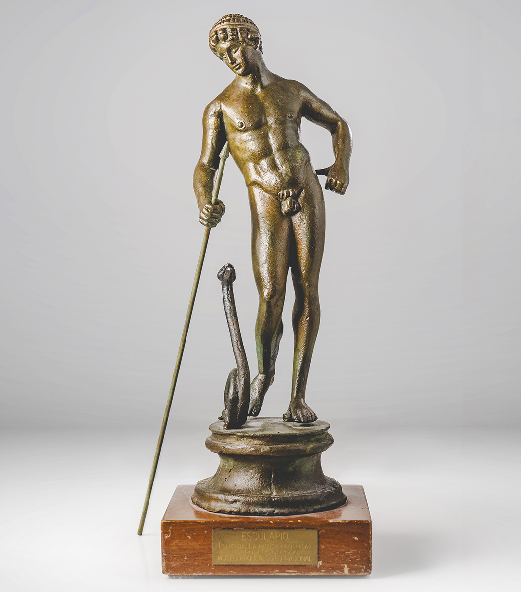 Esta figura en bronce macizo reproduce la pieza hallada en la antigua Pollentia (actual Pollença), capital romana de las Baleares. Esculapio aparece representado como un joven atlético que sostiene con la mano derecha una lanza de su estatura, en lugar del bastón habitual. A su lado, una serpiente se alza sobre el suelo, completando el conjunto simbólico que une fuerza, sabiduría y sanación.