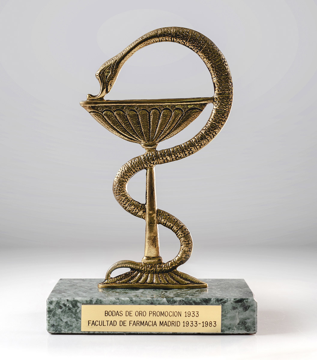 La pieza corresponde a la celebración del cincuentenario de una promoción de licenciados en Farmacia por la Universidad de Madrid; así lo hace constar una placa dorada en la base rectangular de mármol verde: ‘Bodas de oro promoción 1933-1983 / Facultad de Farmacia Madrid 1933-1983’.