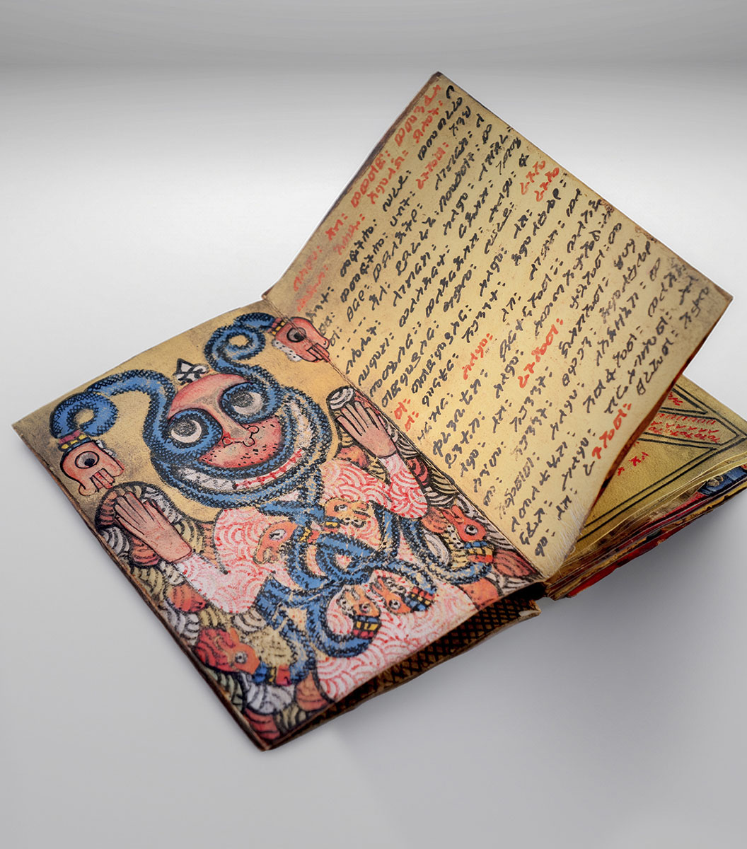 En la ilustración de la página izquierda aparece una figura sobrenatural o protectora, con un rostro humano de rasgos exagerados: ojos grandes y circulares y una sonrisa amplia (comunes en la iconografía mágica etíope). Múltiples extensiones serpentinas o tentáculos que emergen de la cabeza y el cuerpo, simbolizando poder, peligro o combate espiritual; representan tanto las fuerzas malignas como su sometimiento por poderes espirituales. Las manos levantadas representan bendición, rechazo del mal o invocación de protección.