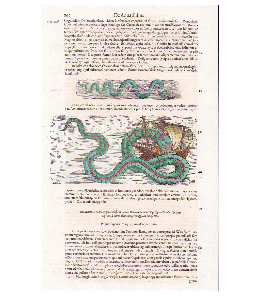 Ilustración coloreada a mano procedente del libro IV sobre los peces donde se representa una gran serpiente marina atacando un barco noruego. Colección particular prof. Jorge Alvar Ezquerra.