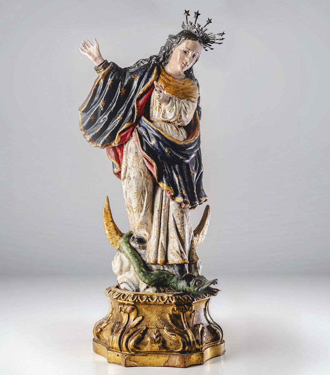 Virgen Inmaculada en posición serpenteante. Con atributos de la mujer apocalíptica (las alas, en este caso no conservadas) y de la Inmaculada Concepción (la media luna), aparece pisando una serpiente en alusión al Pecado Original (Génesis 3:15): «Y pondré enemistad entre ti y la mujer, y entre tu simiente y la simiente suya; esta te herirá en la cabeza, y tú le herirás en el calcañar».
